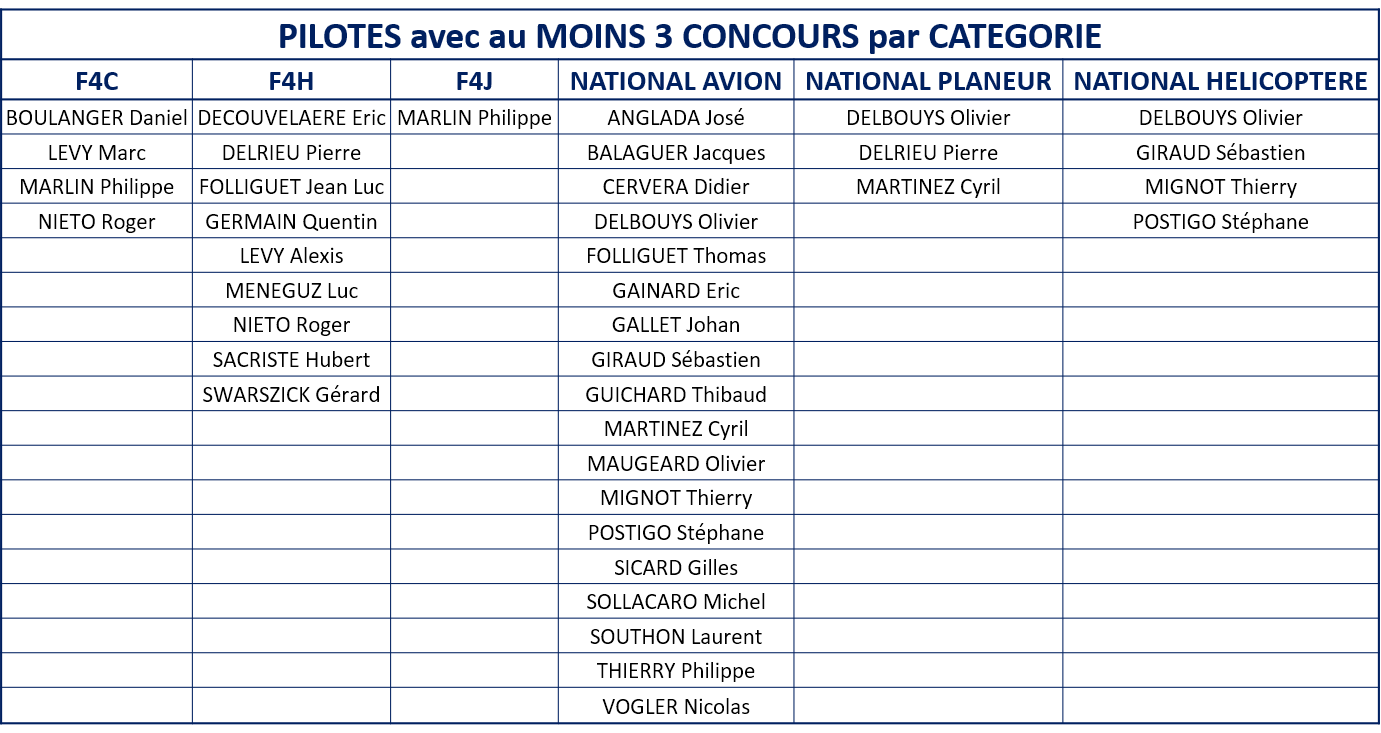 Pilotes ayant participé à au moins 3 concours maquettes dans une même catégorie depuis le 1er janvier 2023: